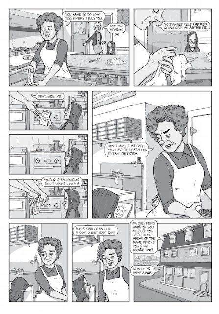 Beyond the spankings with a wooden spoon that were "for her own good," it's obvious that the real heart of the problem was that Boyd never felt heard or believed. Her mother demanded rigid honesty but never forgave Boyd's childish fibs and frequently ignored what would later be serious concerns. A child who feels like they aren't being heard is one who will begin to keep secrets. Moreover, that's a child who won't share their traumatic experiences with their parents and get help. This is exactly what happened to Boyd, and there's a climactic scene where she had horrible premenstrual cramping prior to menarche, but her mother accused her of faking them. When Boyd's period arrived and she was cleaning her own sheets, which in itself is a pointed act -- she didn't come to her mother for help. When her mother realized that she was telling the truth, years of frustration spilled out of Boyd: "You never believe me! I'm afraid to tell you anything! Everything's my fault! Nothing's ever good enough!" This panel perfectly encapsulates Boyd's style as a cartoonist: cartoony and slightly grotesque, emphasizing distinctive facial features like her nose.